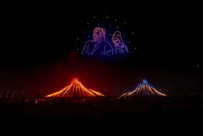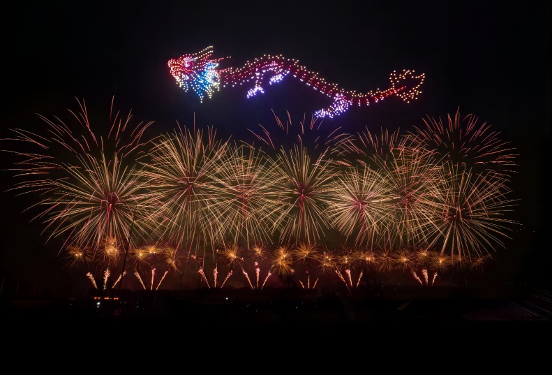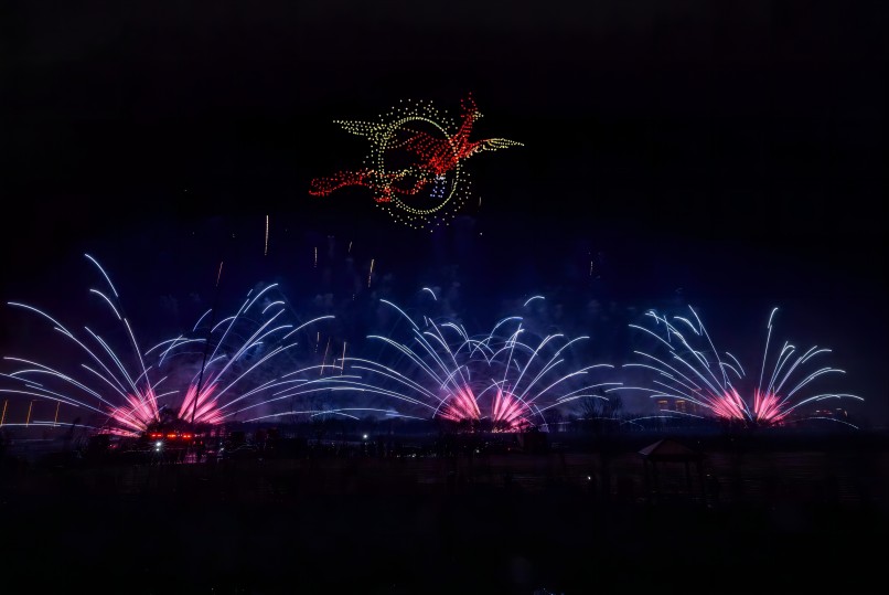 在煙花秀表演期間,由1000架無人機(jī)組成無人機(jī)群在空中組成了多個畫面,“鳩茲和鳴”鳩鳥飛舞栩栩如生,還有“龍呈祥瑞”金龍昂首喚春歸。