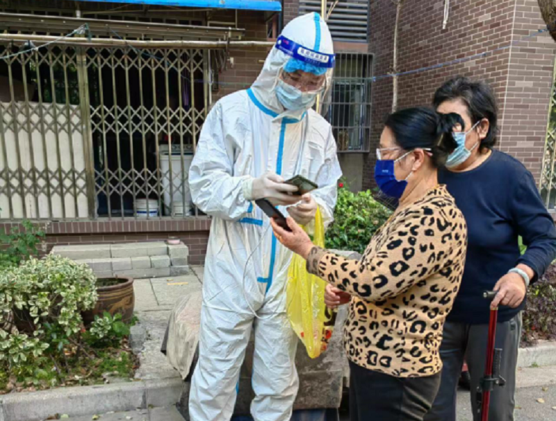 部分黨員志愿者在鏡湖區(qū)某封控社區(qū)內(nèi)對(duì)居家隔離人員進(jìn)行上門核酸檢測(cè)。