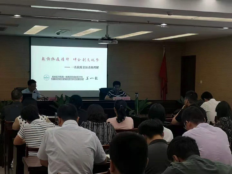 作為安徽首批援鄂醫(yī)療隊總負(fù)責(zé)人,姜小敢主任曾帶領(lǐng)團(tuán)隊分別在武漢太康醫(yī)院、協(xié)和東西湖醫(yī)院、肺科醫(yī)院開展了“疫情阻擊戰(zhàn)”、“疫情圍剿戰(zhàn)”和“疫情殲滅戰(zhàn)”。姜主任從抗疫經(jīng)歷回顧、感悟抗疫精神、體會制度優(yōu)勢等三方面回顧和分享了他馳援武漢抗擊疫情的經(jīng)歷和體會。一幅幅身臨一線的圖片、一段段飽含深情的話語,生動再現(xiàn)了疫情發(fā)生后,全國各地醫(yī)護(hù)人員、防疫人員、共產(chǎn)黨員及社會各界不怕危險、不怕犧牲,筑起防御病毒的堅強(qiáng)堡壘的感人事跡。那一段段用生命守望生命的故事讓現(xiàn)場的每位聆聽者心靈都受到強(qiáng)烈震撼和感動。